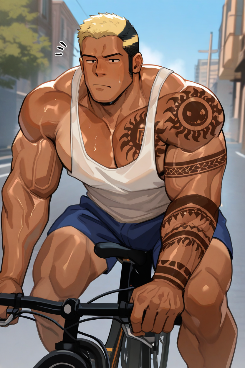 キャラクター: ketaro, 1人の男性、ツートーンヘア、イエローヘア、黒いストライプ入りヘア、長い口ひげ、クルーパー、黒い目、小さい目、日焼けした肌、筋肉質
