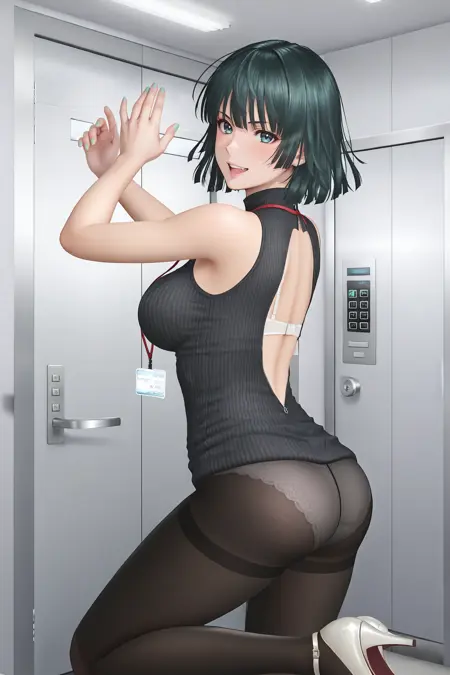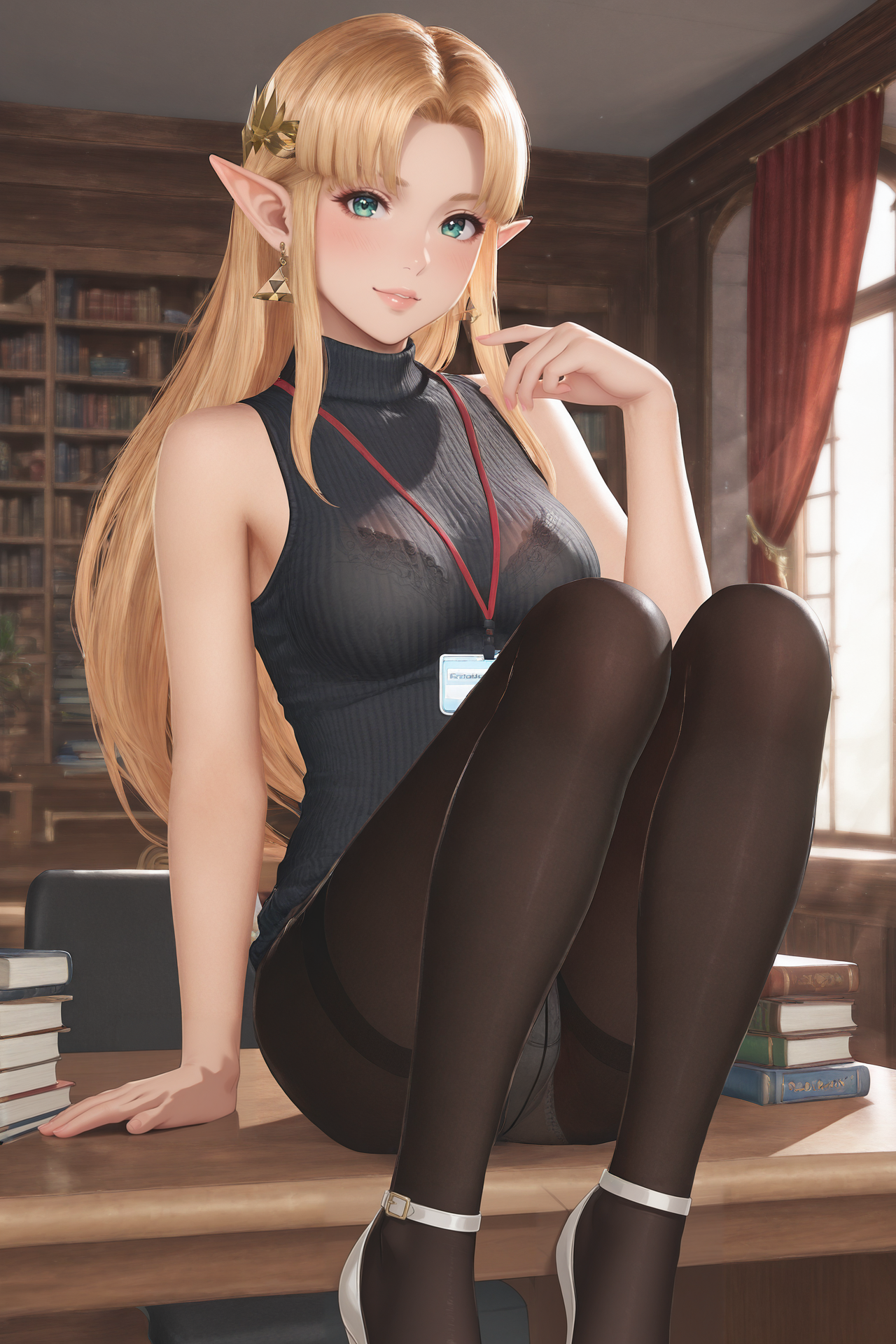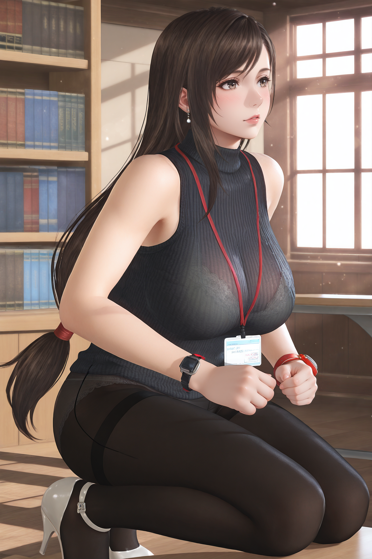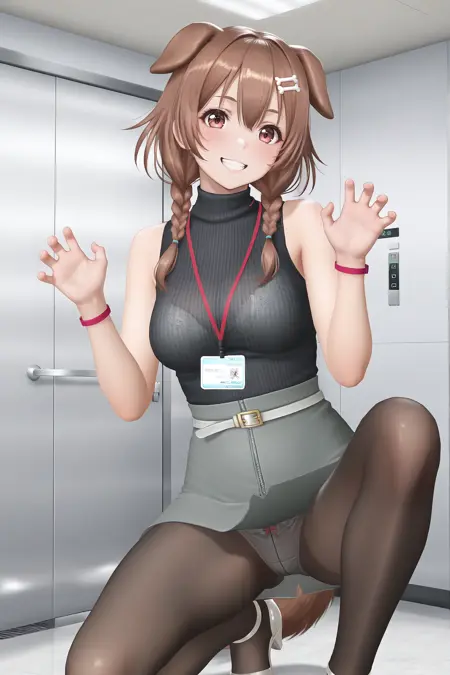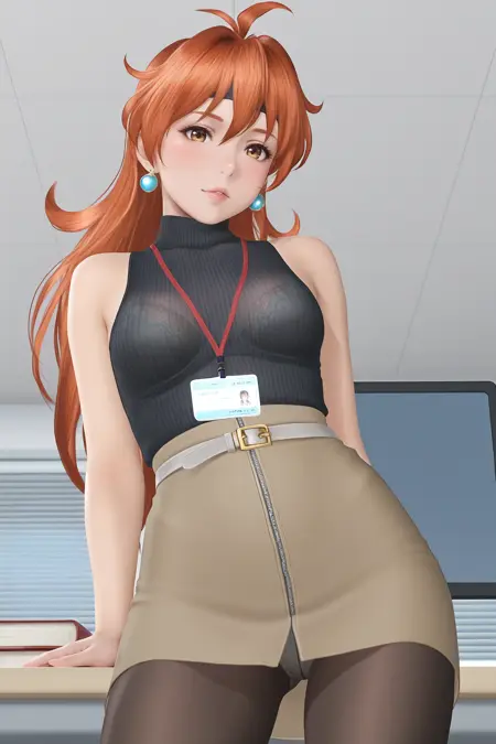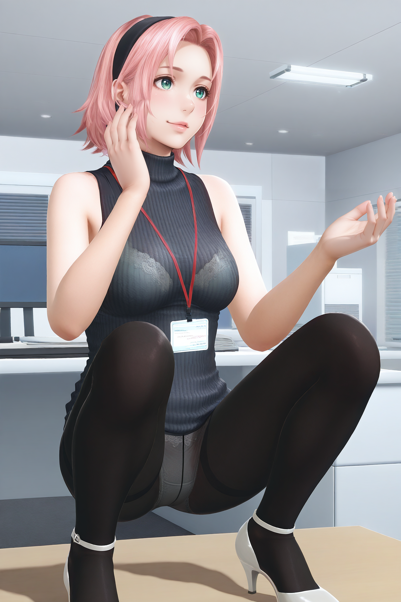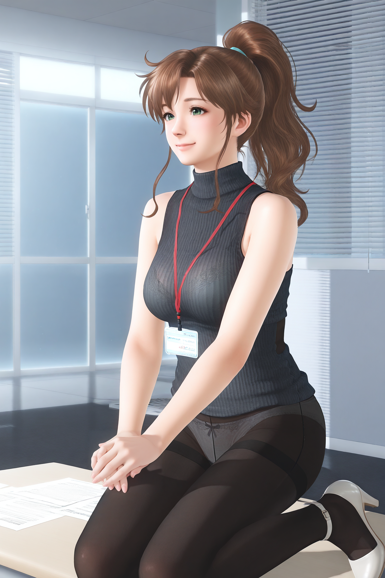Main Outfit: YomXDOA, black pantyhose, turtleneck, sleeveless ribbed sweater, {brown|gray} skirt, lanyard, id card, office lady, underwear, belt, white high heels, bra visible through clothes, bralines, panties under pantyhose, see-through