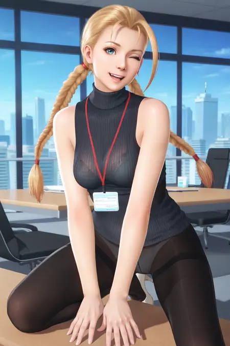 Malfunction Version: YomXDOA, alternate costume, wardrobe malfunction, thighband pantyhose, black pantyhose, turtleneck, sleeveless ribbed sweater, lanyard, id card, white high heels, office lady, underwear, bra visible through clothes, bralines, panties under pantyhose, see-through