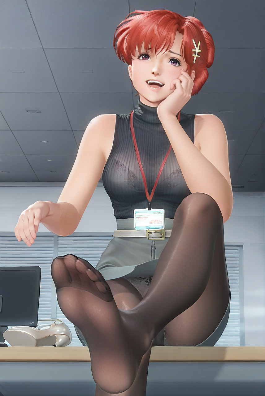 Foot Message: foot focus, no shoes, soles, toes, fine fabric emphasis, foreshortening, hand on own cheek, hand on own face, leg up, legs, sitting on desk, head rest