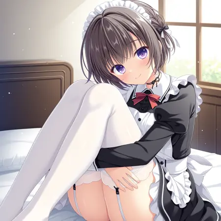 maid,hair bow,black bow,white bow,maid headdress,white thighhighs,garter straps,long sleeves,frills,red bowtie,puffy sleeves,black dress,juliet sleeves,maid apron,white apron,red ribbon,