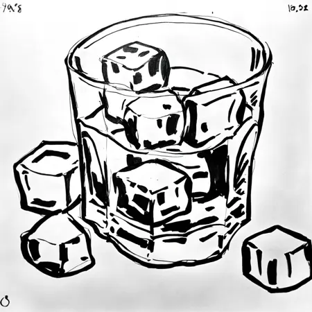 black and white clean drawing, glass of whater, ice cubes, v0idraw