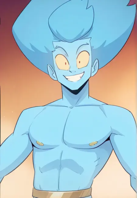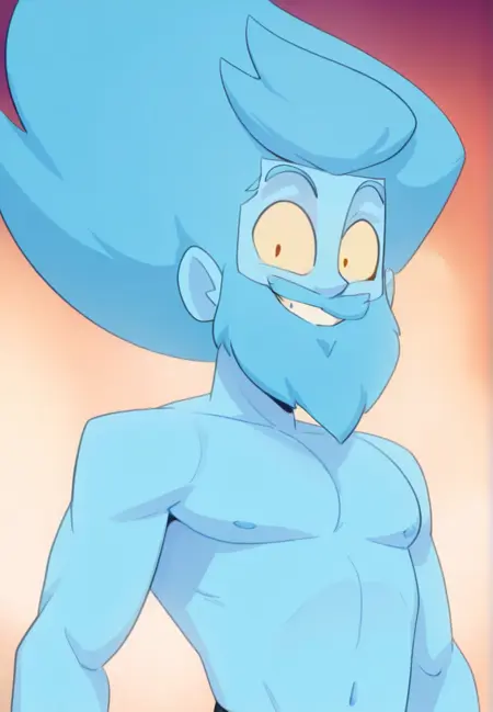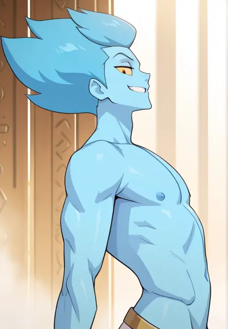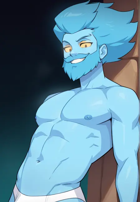 1boy, blue skin, blue hair, yellow sclera, underwear, naked torso