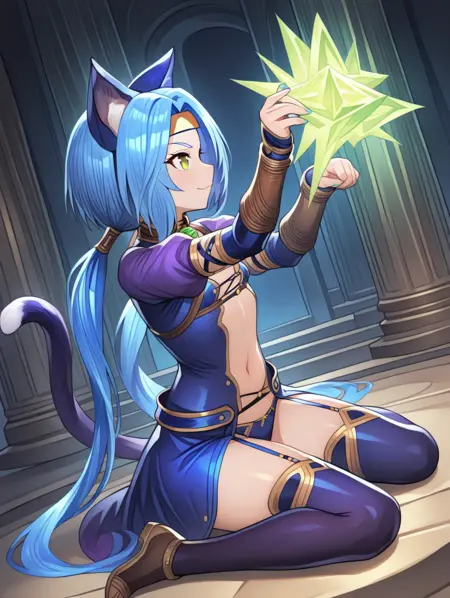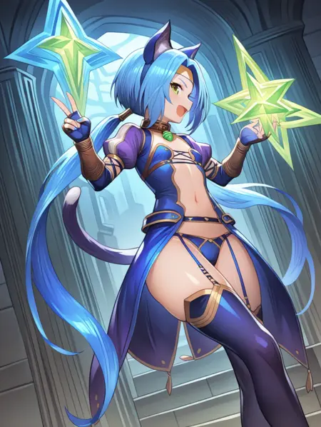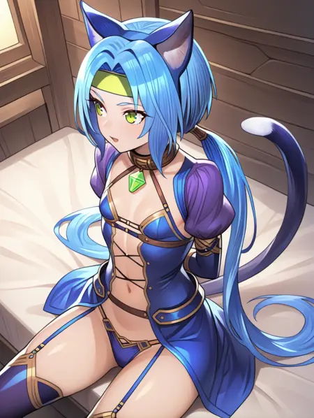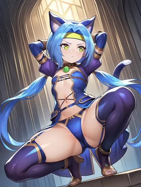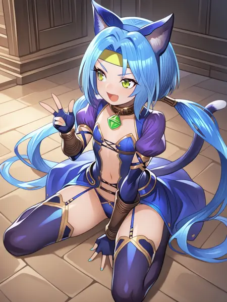 prompt example :merikuru,blue hair,low twintails,green eyes,cat ears,headband,cat tail,blue dress,puffy sleeves,navel,panties,garter straps,thighhighs,