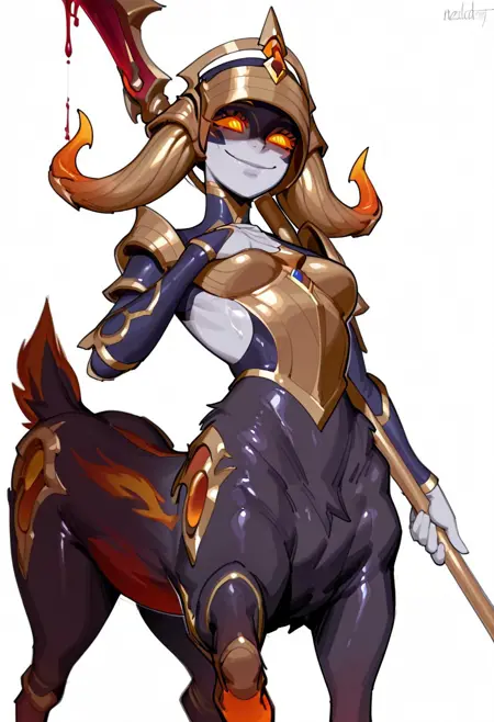 1girl, nightbringer_lillia, taur, 鹿女孩, 萨提尔, 双色皮肤, 多色皮肤, 灰色皮肤, 紫色皮肤, 橙色长睫毛, 彩色巩膜, 橙色巩膜, 琥珀色眼睛, 发光眼睛, 燃烧的眼睛, 弯曲的角,
