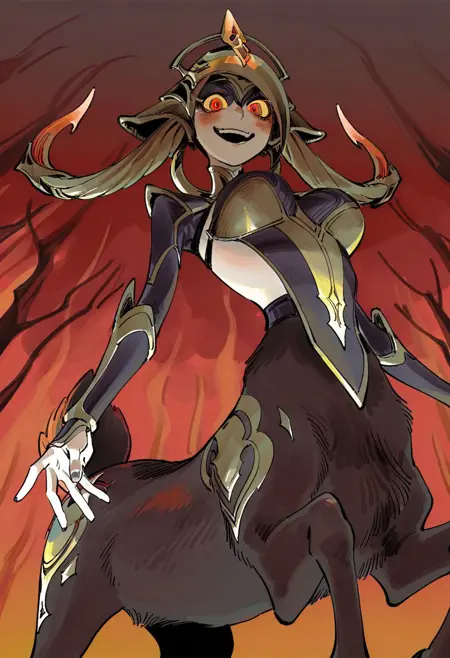1girl, nightbringer_lillia, taur, 鹿の少女, faun, ツートーン肌, 多色肌, 灰色の肌, 紫色の肌, オレンジ色の長いまつげ, 色付きの巩膜, オレンジ色の巩膜, アンバーの目, 輝く目, 燃える目, 曲がった角,