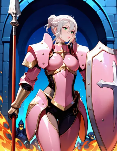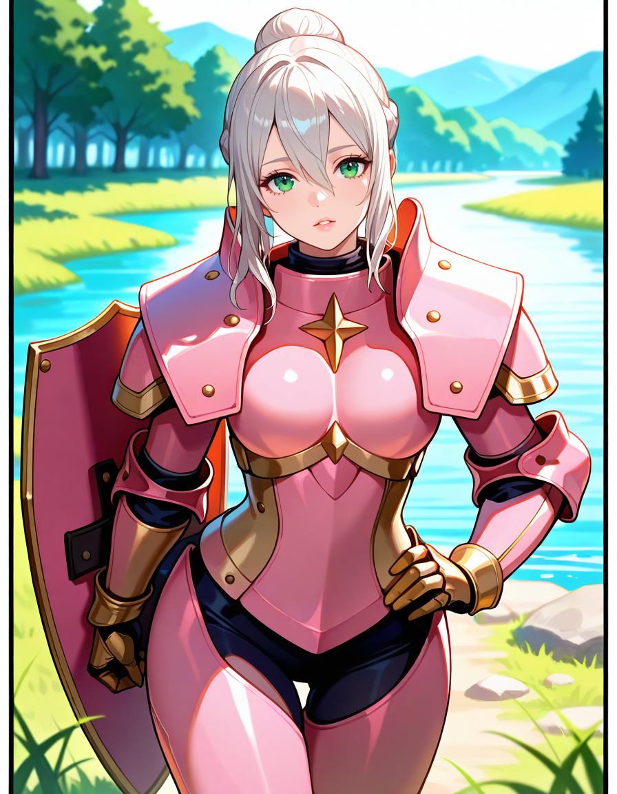 EffieFE, green eyes, silver hair, ponytail, 1girl, lips, pink armor, thigh gap, hip armor