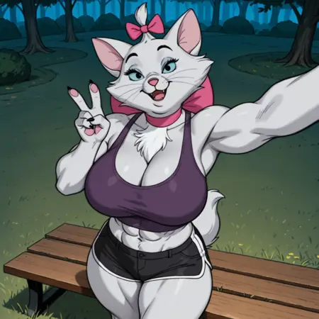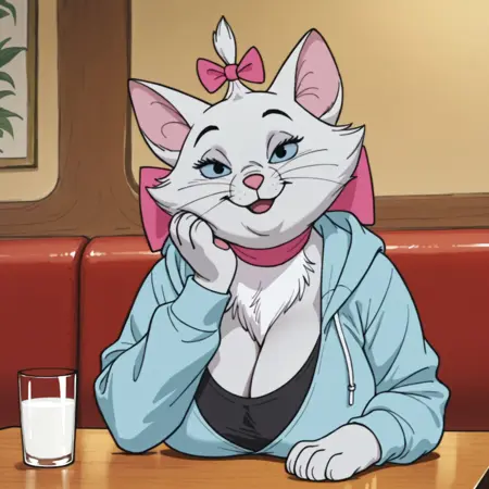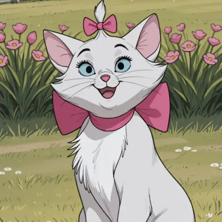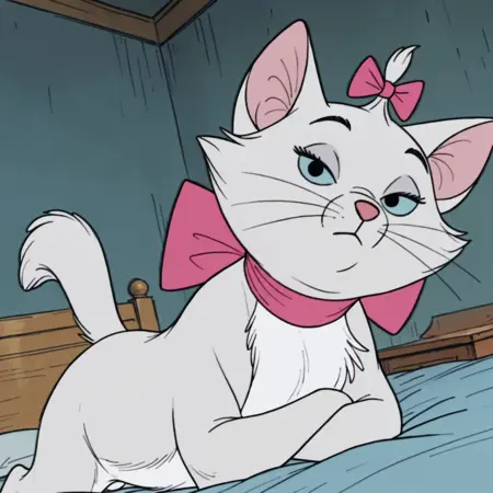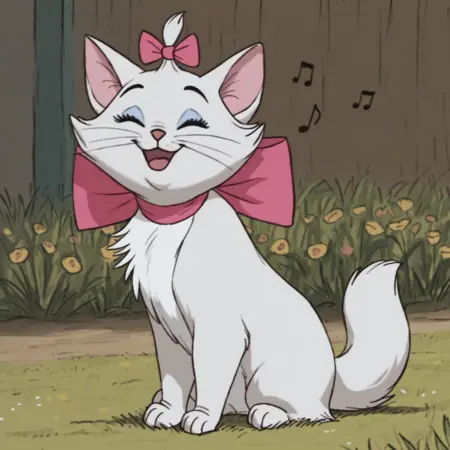 Marie is one of the side characters from the Disney movie the Aristocats. This has been trained with about 25 image screencaps in 1080p with no fanart included. It may generate extra whiskers sometimes, but everything else works perfect. Very rarely will it give her pink eyeshadow which is not accurate to her design, so put "pink eyeshadow" in the negative prompts to not have that happen.