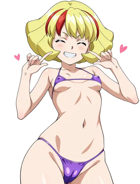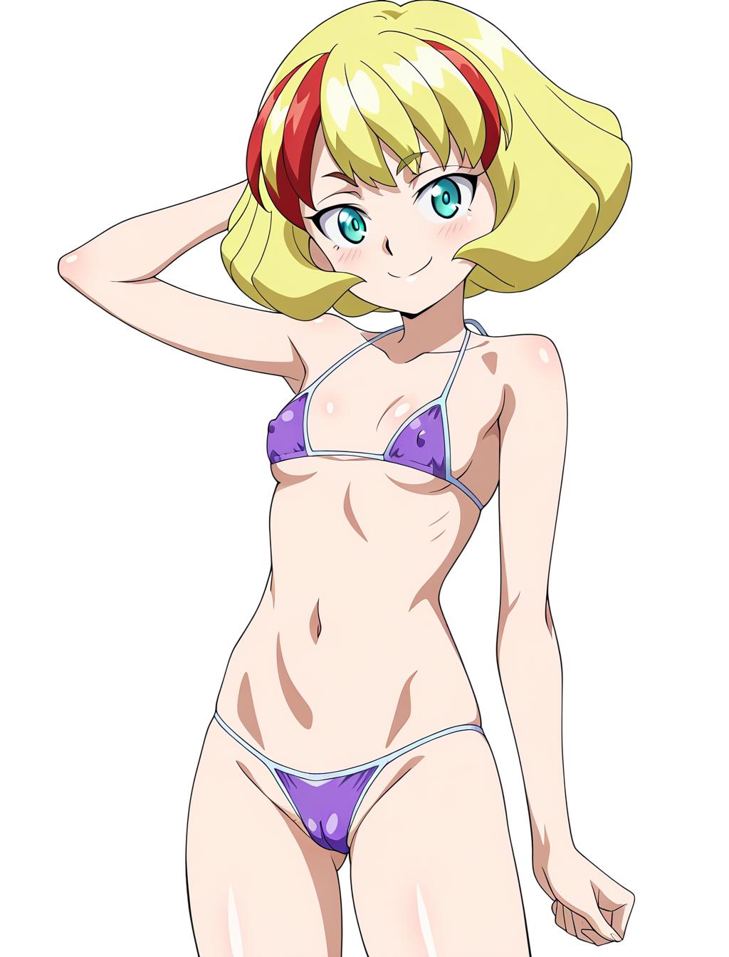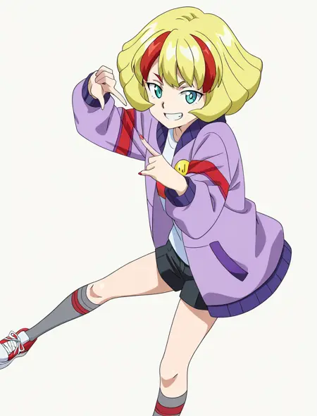 プロンプト: purple oversized jacket with red accents, white undershirt, black shorts, gray thigh-high socks with red stripes, red-and-white sneakers, short wavy blond hair with red streaks, turquoise eyes