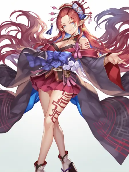 prompt example :oirann,red hair,very long hair,forehead,blue eyes,hairpin,hair ornament,pointy ears,earrings,japanese clothes,cleavage,bare shoulders,wide sleeves,ribbon,miniskirt,flower,tattoo,tabi,platform footwear