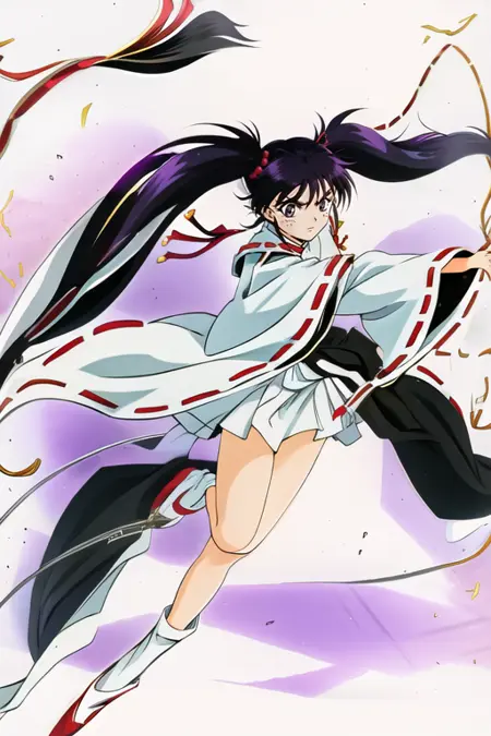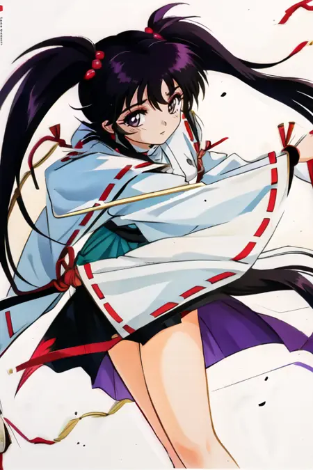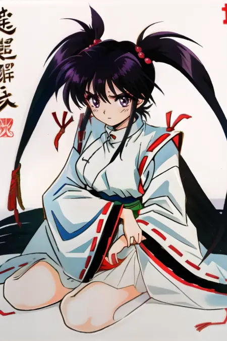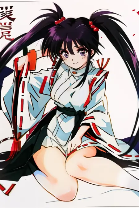 black_hair,black_eyes, hair_ornament, japanese_clothes, twintail_hair, long_sleeves, miko, ribbon-trimmed_sleeves, wide_sleeves, white_skirt,