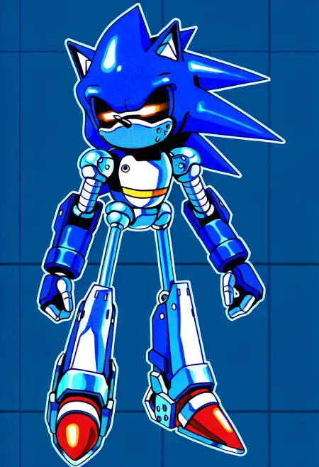 MechaSonicMk2, 1boy, robot, mecha, sonic the hedgehog, blue metal, light blue belly, light blue muzzle, metal fins on head, triangular ears, red shoes, horizontal optic sensor eyes, rectangle nose,