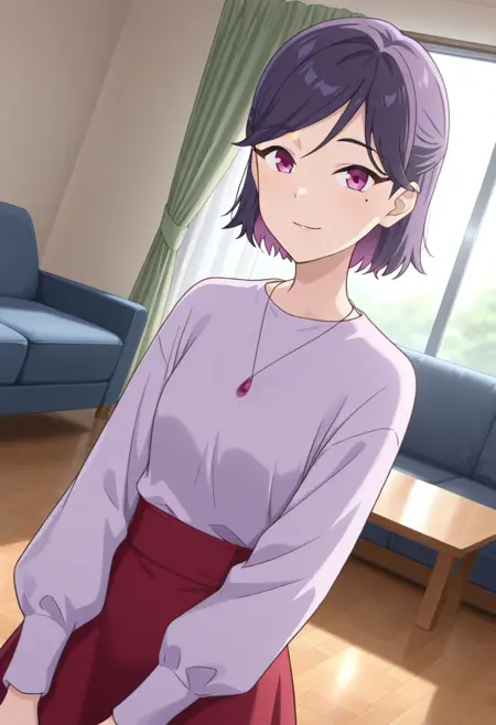 紫髪、ショートヘア、ハーフアップ、紫目、目の下のほくろ、