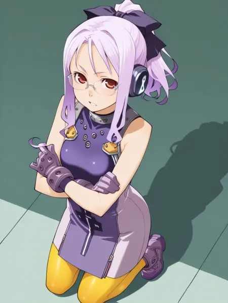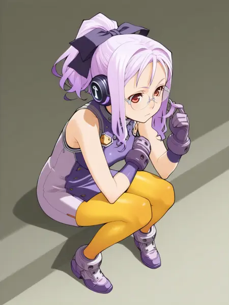提示词示例:SO4weruti,紫色头发,马尾,耳机,丝带,眼镜,红眼睛,紫色连衣裙,无袖,手套,黄色丝袜,鞋子,单人,