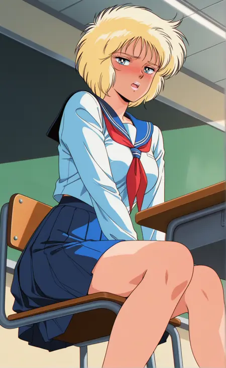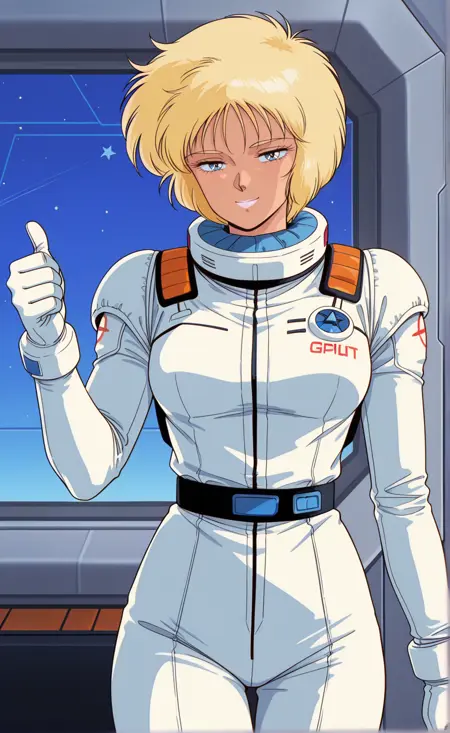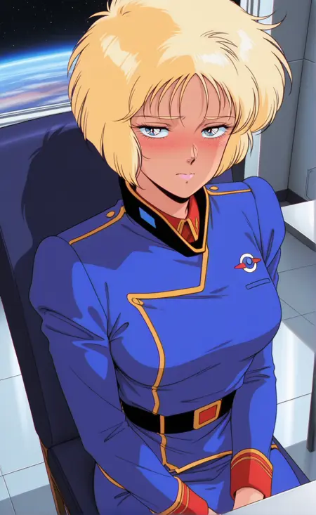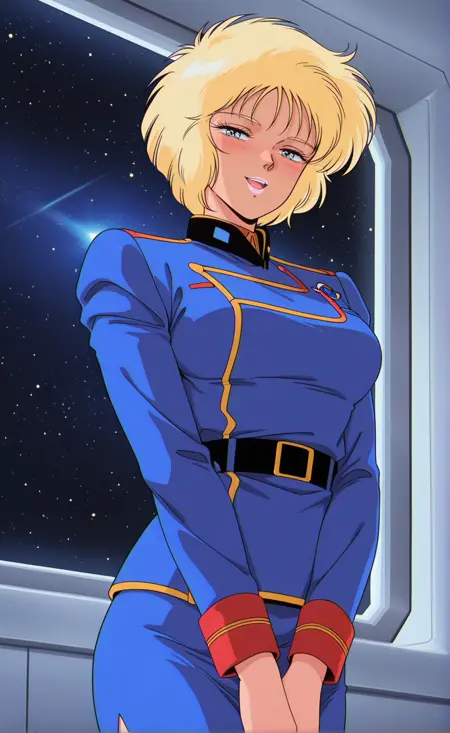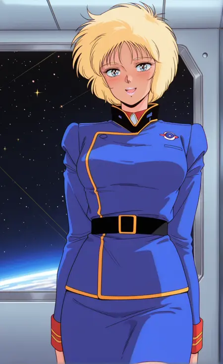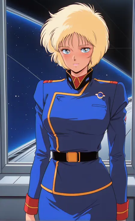 1girl,gndmzzemronc,retro artstyle,1980s (style),solo, blonde hair, short hair,eyelashes, blue eyes,medium breasts, lipstick, uniform, skirt,military uniform,blue jacket, belt, long sleeves, blue skirt,indoors,window,star \(symbol\),sky,space,looking at viewer,cowboy shot,smile, best quality,masterpiece,sensitive, lora:GundamZZEmaryOunceNoobAI2:1