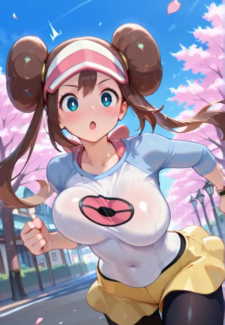 blue_eyes, white_pupils, brown_hair, long_hair, double_bun, twintails, medium_breasts, visor_cap, black_pantyhose, yellow_skirt, raglan_sleeves, white_shirt, blue_sleeves