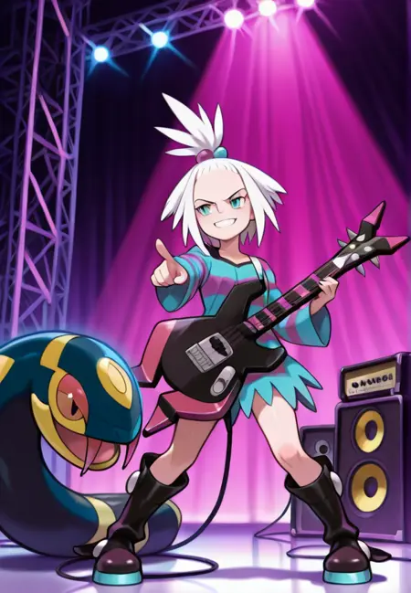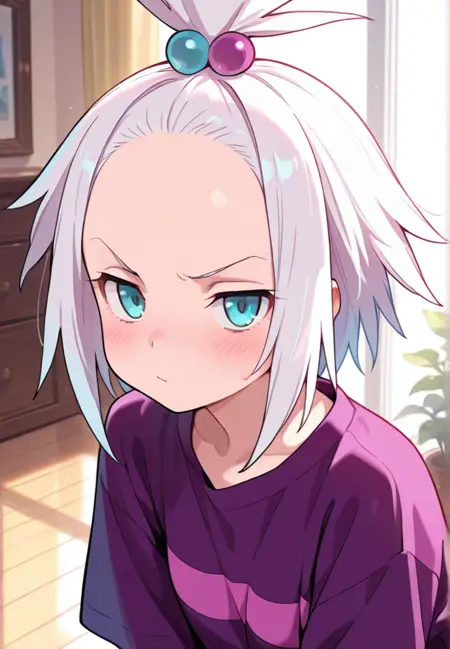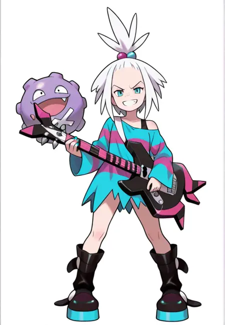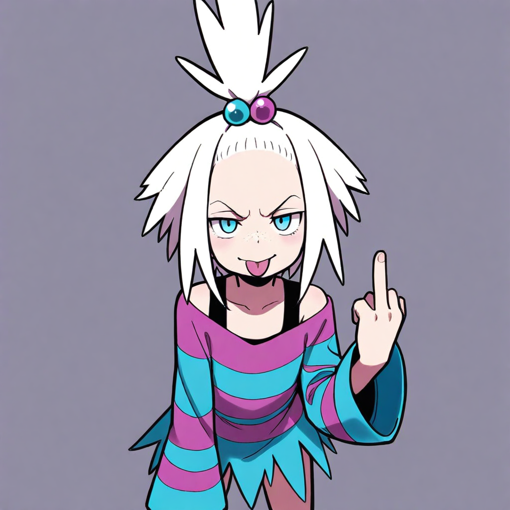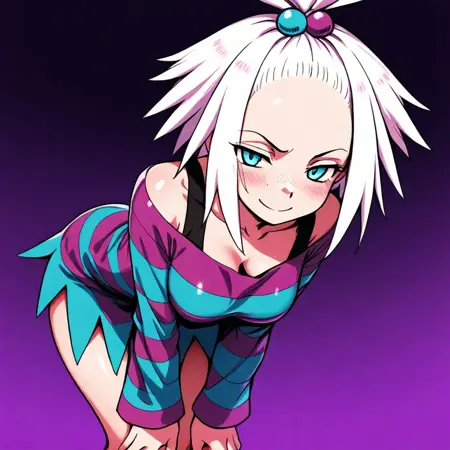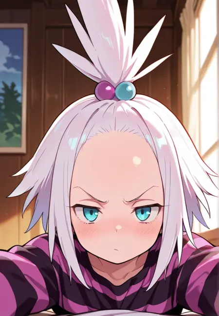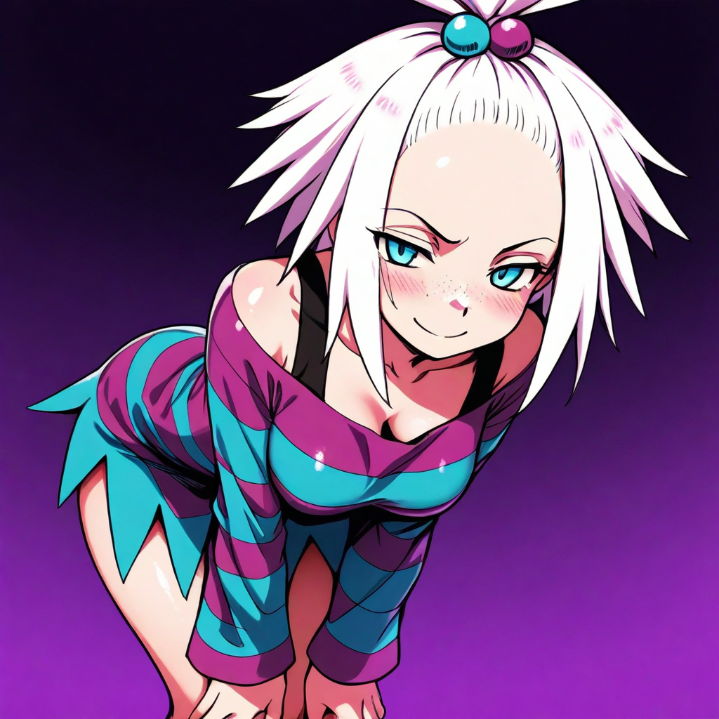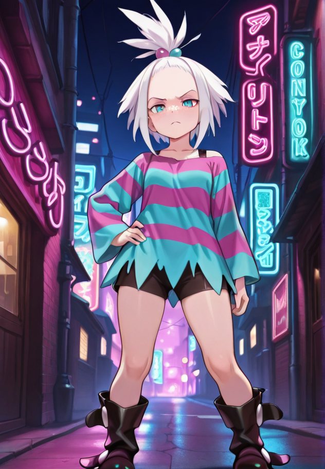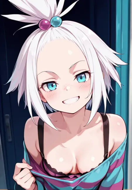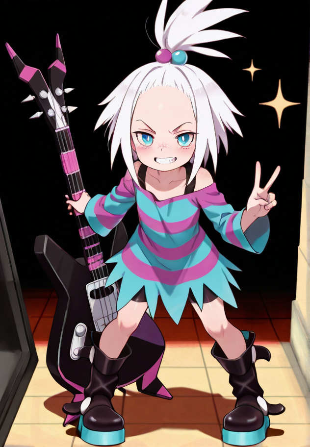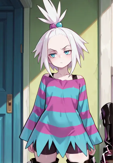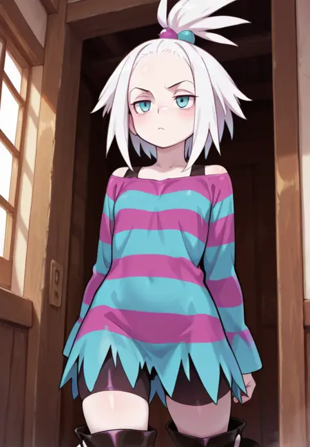 탑킷, 흰색 머리, 파란 눈, 창백한 피부, 두더지, 이마, 줄무늬 드레스, 바이크 쇼츠, 부츠,