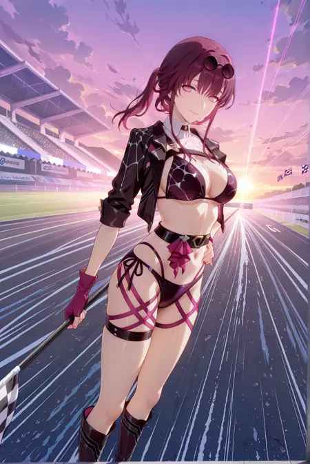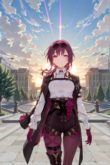 Outfit: kaf-mom, default, 1girl, long hair, purple hair, purple eyes, sunglasses on head, black coat, coat on shoulders, white shirt, collared shirt, long white sleeves, chest harness, purple gloves, high-waist shorts, black shorts, purple straps, purple pantyhose, asymmetrical footwear, single thigh boot