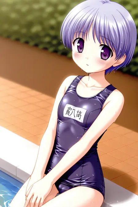 school swimsuit,blue one-piece swimsuit,old school swimsuit,shiny clothes,name tag,bare shoulders,bare arms,