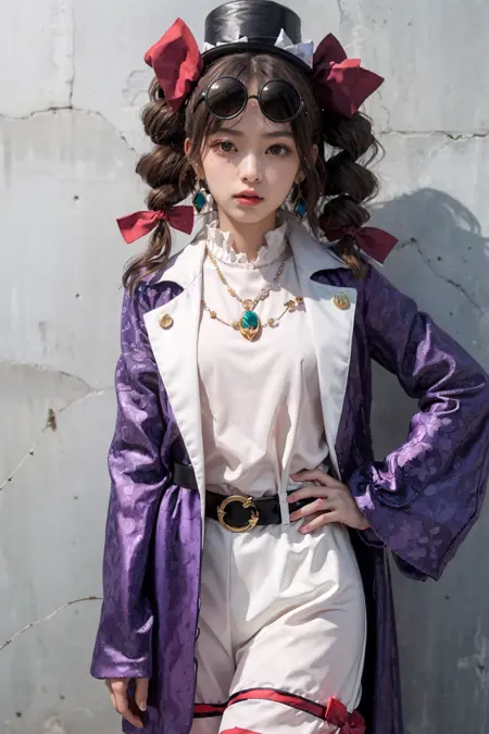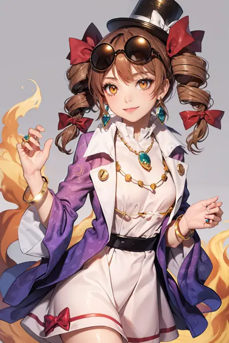 yorigami jo'on,1girl,top hat,hat bow,red bow,hair bow,brown hair, sunglasses,eyewear on head,drill hair,orange eyes,earrings,gem, jewelry, bow, ring,pendant,necklace,buckle, high collar, long sleeves,wide sleeves,bracelet, purple coat, tachi-e, open clothes, belt, white dress,red ribbon, floral print, fire,