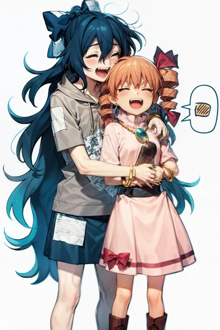 2 people: yorigami shion, yorigami jo'on,multiple girls, 2girls,top hat,hat bow,red bow,hair bow,brown hair, sunglasses,eyewear on head,drill hair,orange eyes,earrings,gem, jewelry, bow, ring,pendant,necklace,buckle, high collar, long sleeves,wide sleeves,bracelet, purple coat, tachi-e, open clothes, belt, white dress,red ribbon, floral print,ery long hair, absurdly long hair, blue hair, blue eyes,hair bow,hoodie,short sleeves, debt, bracelet,blue skirt,