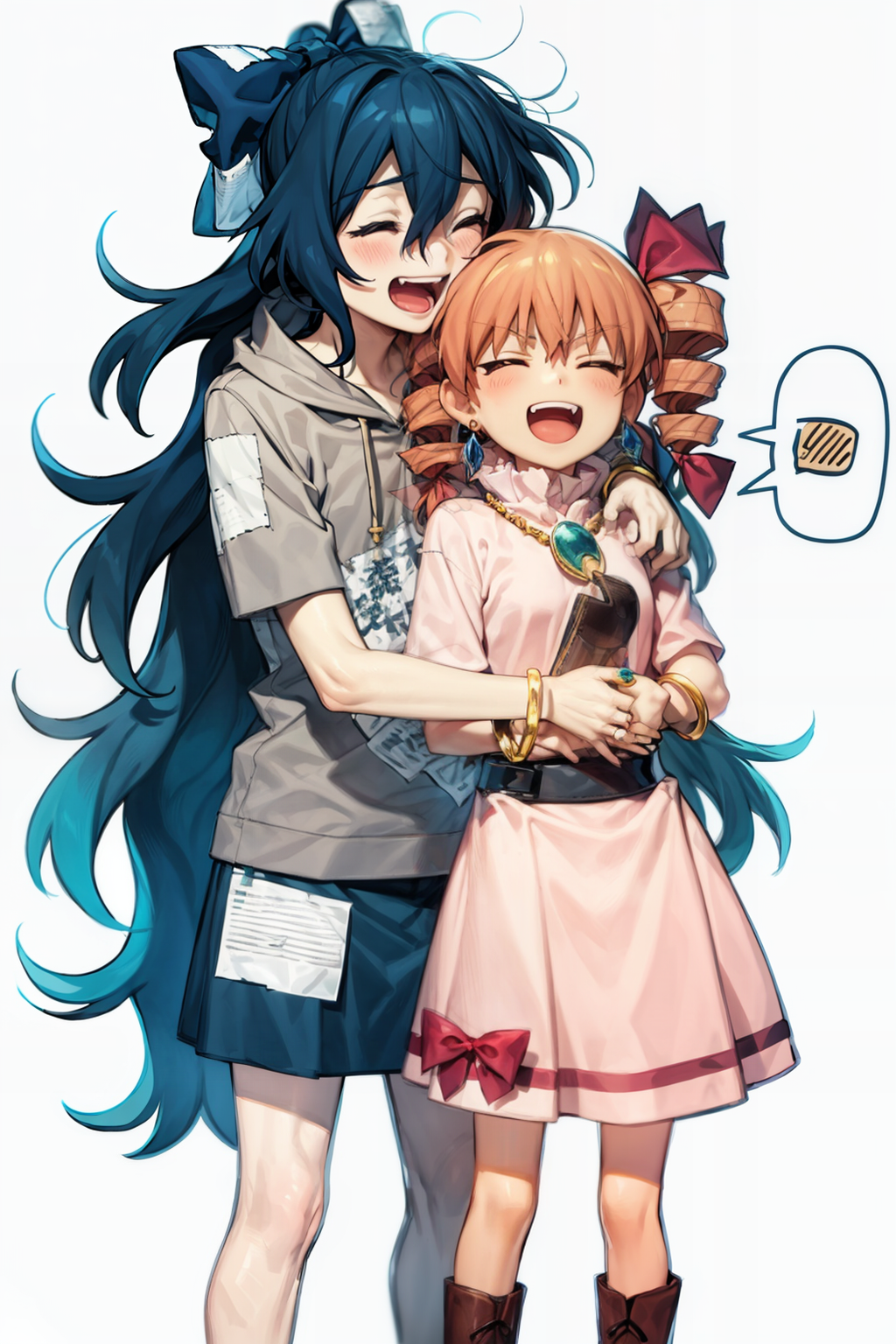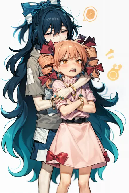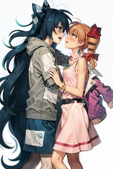 为了能够较为准确的对单个角色进行换装,我把这两位的tag全部填上了,导致出图的时候你需要非常细致的关键词,但同样的,即使两人一起出现,也不太容易混乱,但是你需要致死量的tag。通常来说,你并不需要输入全部tag,请根据不同大模型中缺失的特征来选择。