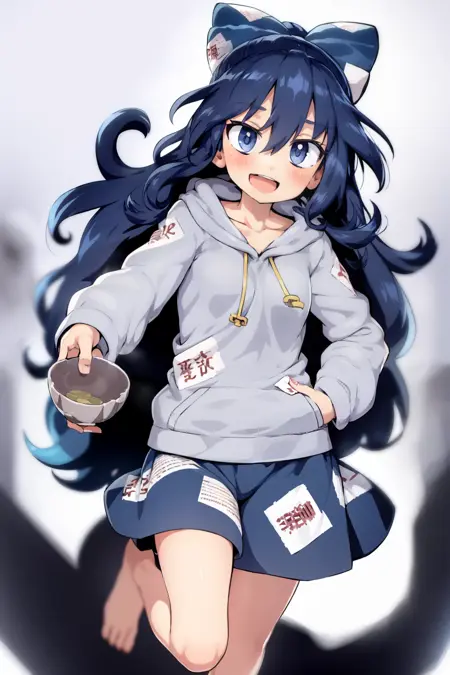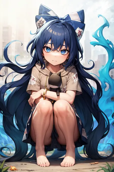 yorigami shion,1girl, very long hair, absurdly long hair, blue hair, blue eyes,hair bow,hoodie,short sleeves, debt, bracelet,blue skirt, stuffed cat,damaged, shaded face,
