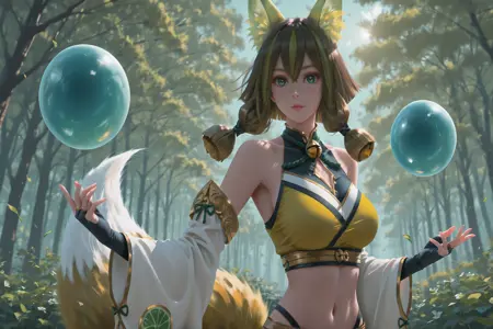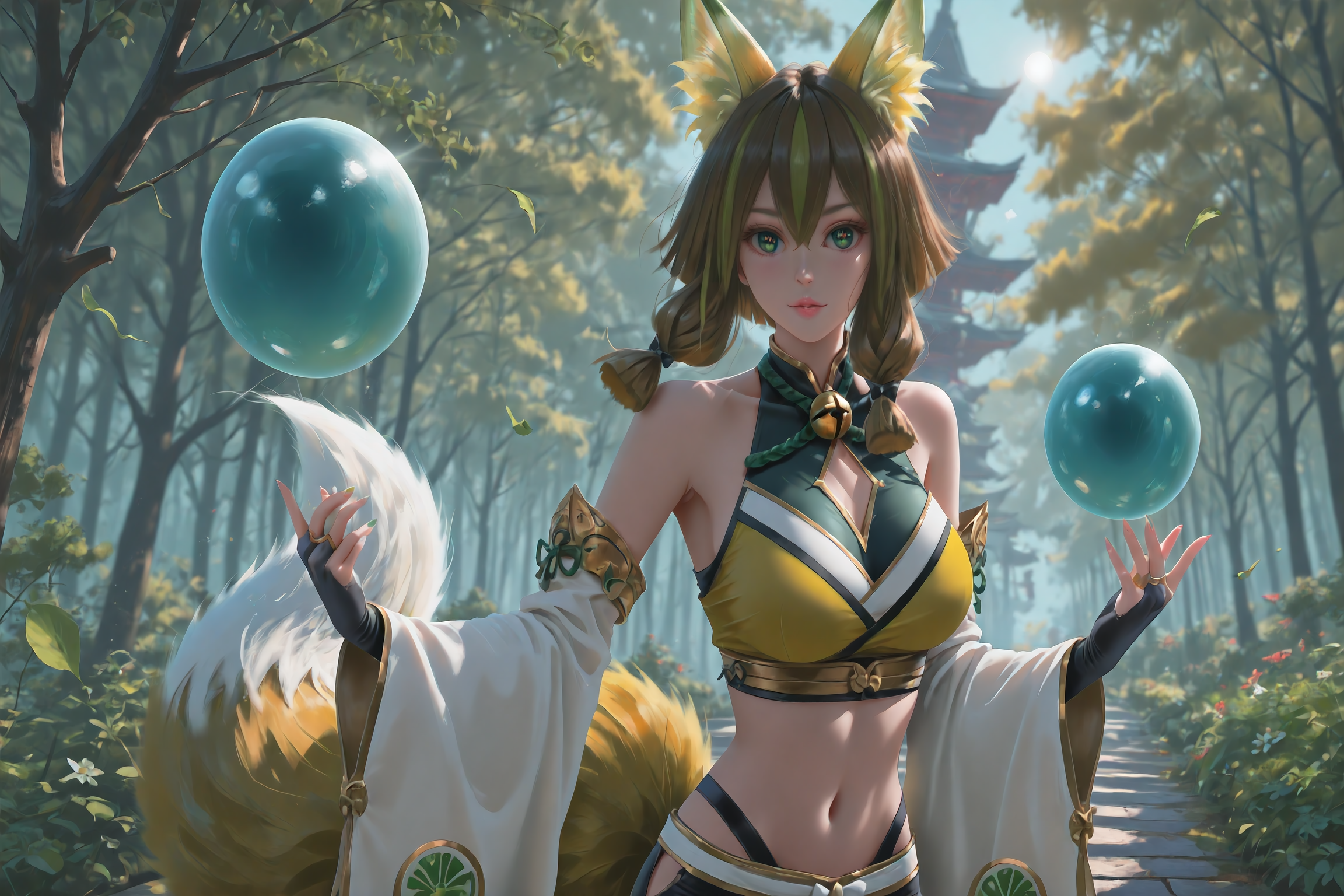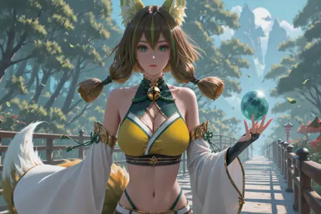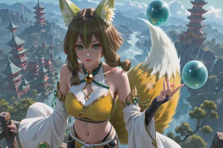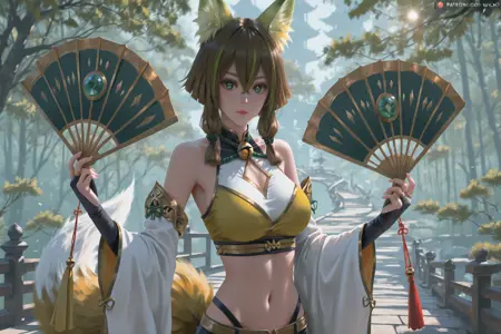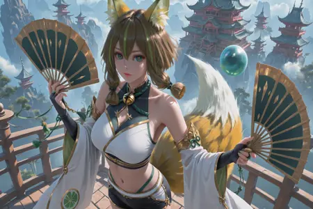 Hu-Li the Jewel Mikanko,1girl,solo,crop top,animal ears,navel,fox ears,green eyes,midriff,detached sleeves,streaked hair,bare shoulders,stomach,wide sleeves,hand fan,tail,fox tail,multicolored hair,holding fan,sleeveless shirt,bell,fox girl,shirt,brown hair,long sleeves,jingle bell,black gloves,sleeveless,gloves,animal ear fluff,white sleeves,bridal gauntlets,clothing cutout,folding fan,shorts,crossed bangs,