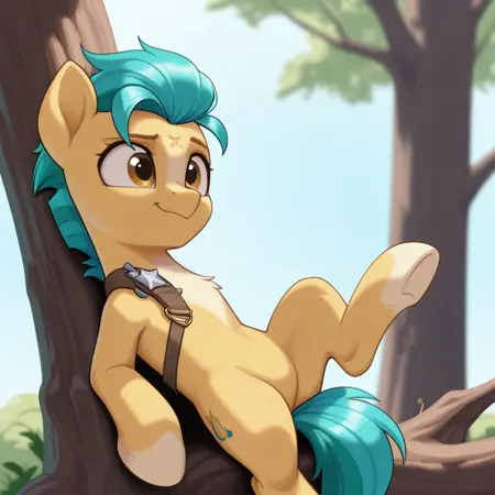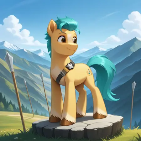 earth pony, golden peach body, brown eyes, small white mark on forehead, bright turquoise mane and tail, short, tousled mane, darker belt, male