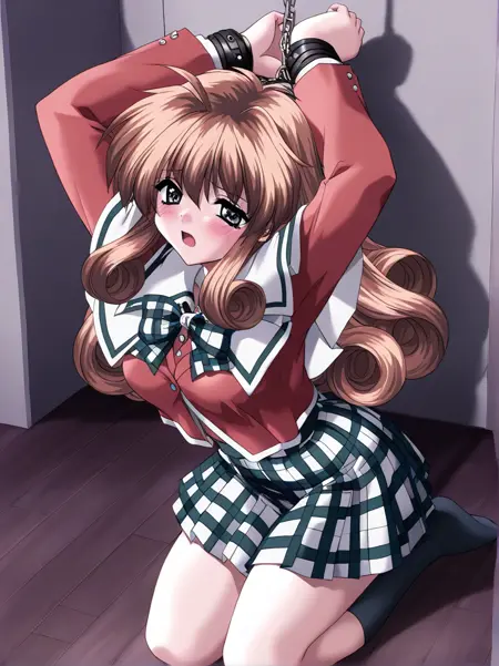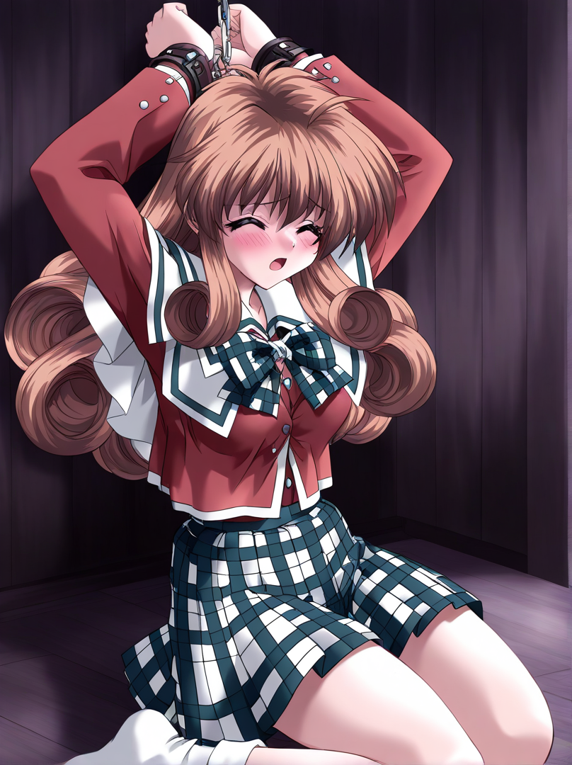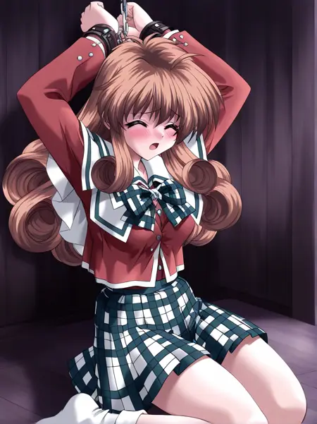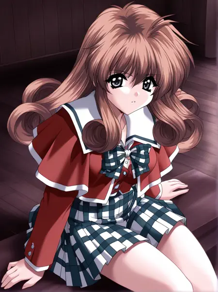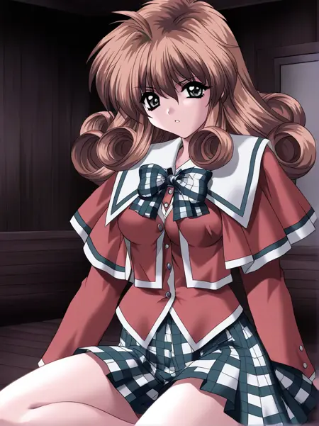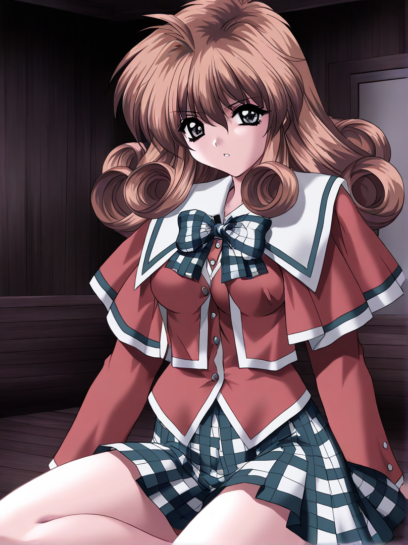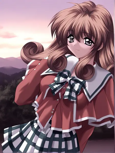Ichijo_Serika, 1girl, solo, long hair, curly hair, brown hair, gray eyes, medium breasts,