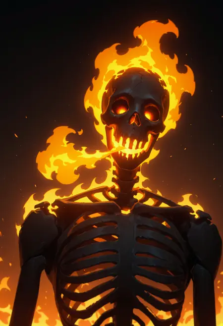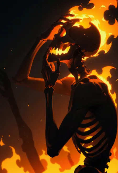 1other, skeleton, silhouette, flaming eyes, fiery hair