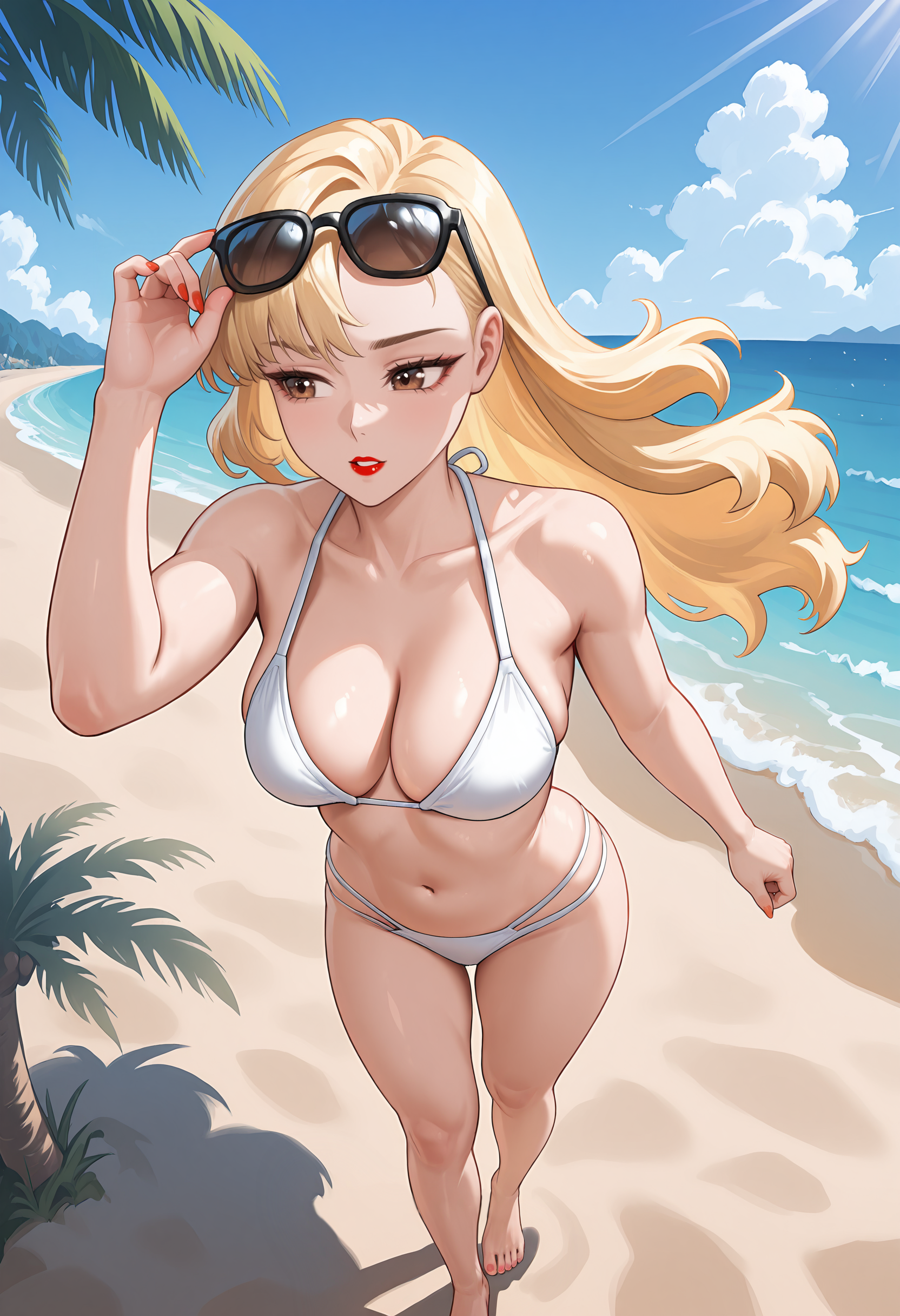 WildGunsAnnie, 갈색 눈, 금발 머리, 긴 머리, 비대칭 앞머리, 빨간 립스틱