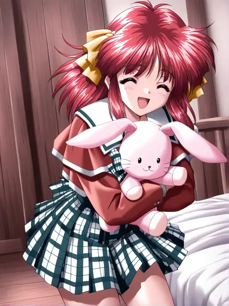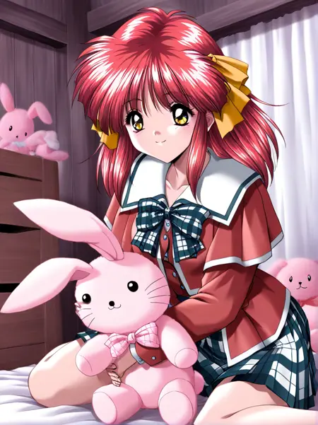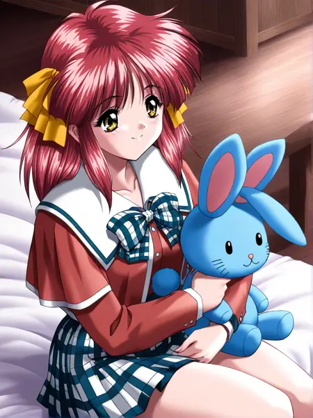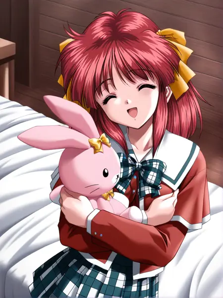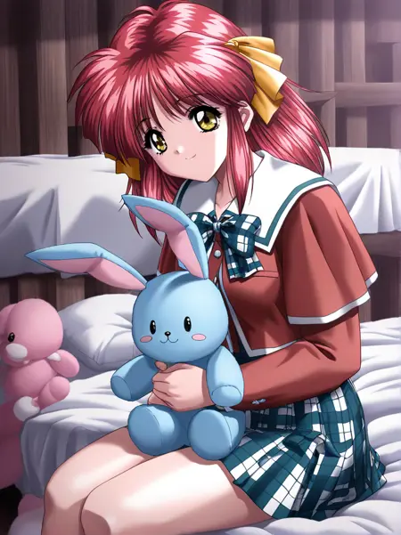 「悪夢」より如月ひなちゃんのLoRAです。この子も鈴ちゃん同様、JK設定に無理があるほど、性格も外見も子供です……何せ女子高生なのに、常にウサギのぬいぐるみと一緒で、そうでないと寂しくて生きられないという、とんでもない女の子です。紳一いわく、「今時、幼稚園児でもぬいぐるみを抱きかかえて歩くなんて真似はしないだろうに」と、少々呆れていたほどです。容姿については、紳一いわく、「美少女というよりは、愛くるしい娘。これまでの女性とはタイプがまるで違う」とのこと。