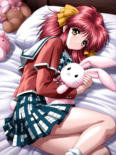 Kisaragi_Hina, 1girl, solo, red hair, medium hair, yellow eyes, hair pink ribbon, small breasts,