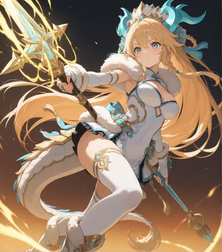 | Trained Words | long hair, blonde hair, blue eyes, horns, headdress, dress, gloves, blush, cleavage, fur trim, tail, medium breasts, hair ornament, very long hair, elbow gloves, thighhighs, white dress, white gloves, boots, fingerless gloves, dragon girl, dragon tail, weapon, chinese clothes, braid, dragon horns, white thighhighs, staffCopied! |