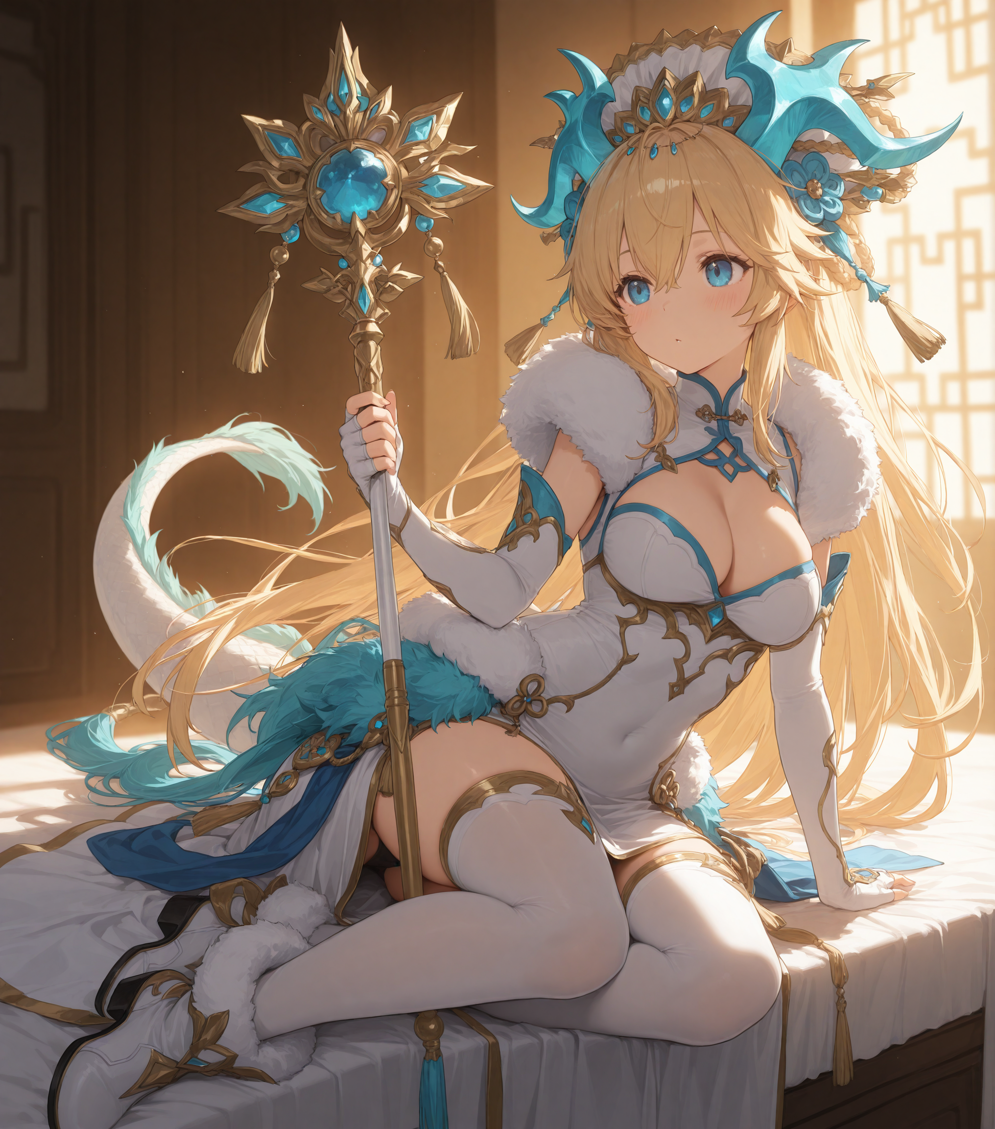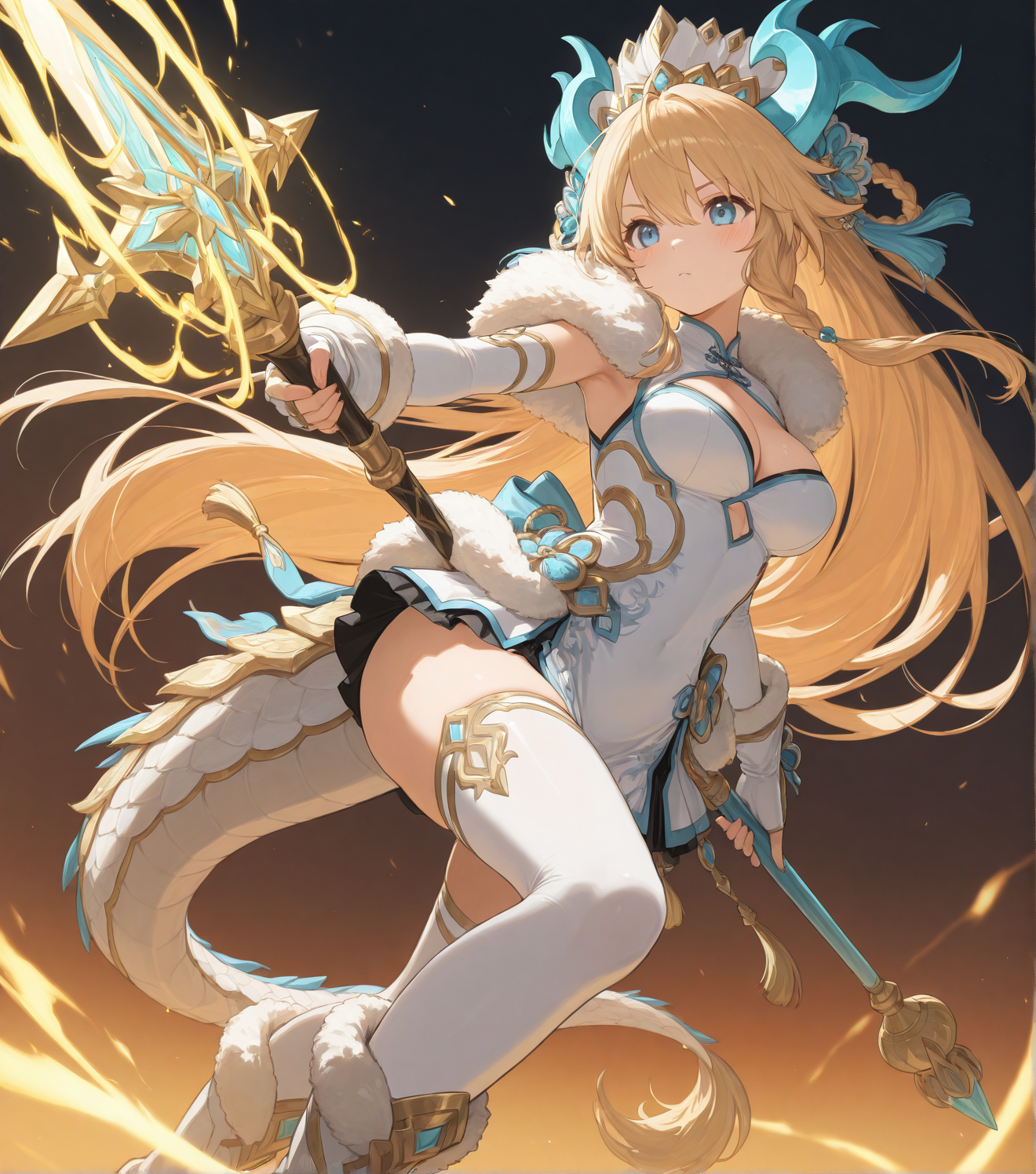 | 학습된 단어 | long hair, blonde hair, blue eyes, horns, headdress, dress, gloves, blush, cleavage, fur trim, tail, medium breasts, hair ornament, very long hair, elbow gloves, thighhighs, white dress, white gloves, boots, fingerless gloves, dragon girl, dragon tail, weapon, chinese clothes, braid, dragon horns, white thighhighs, staff복사됨! |