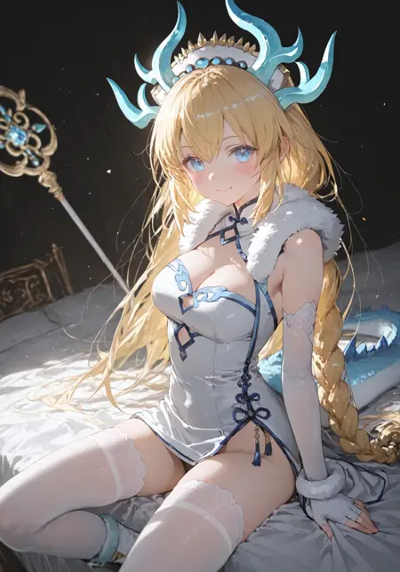 | トレーニングワード | long hair, blonde hair, blue eyes, horns, headdress, dress, gloves, blush, cleavage, fur trim, tail, medium breasts, hair ornament, very long hair, elbow gloves, thighhighs, white dress, white gloves, boots, fingerless gloves, dragon girl, dragon tail, weapon, chinese clothes, braid, dragon horns, white thighhighs, staffコピーしました! |