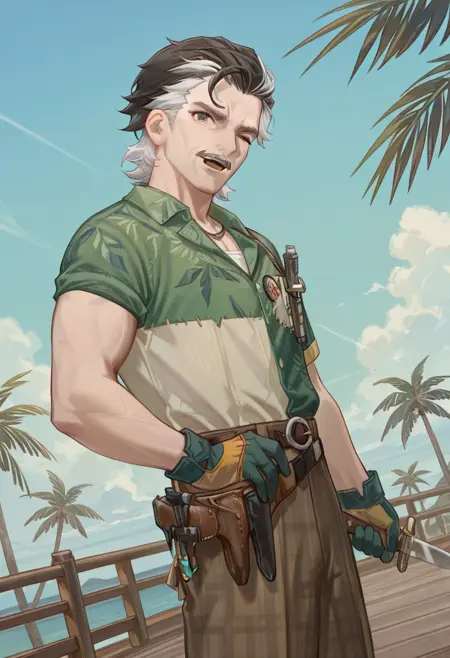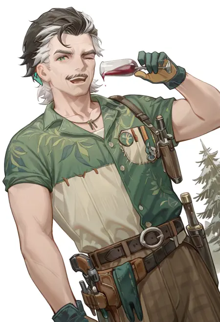 duncan,成熟男性,绿色图案衬衫,皱纹皮肤,肌肉发达,张着嘴,手套,双色头发,胡须,枪套,短发,棕色长裤,