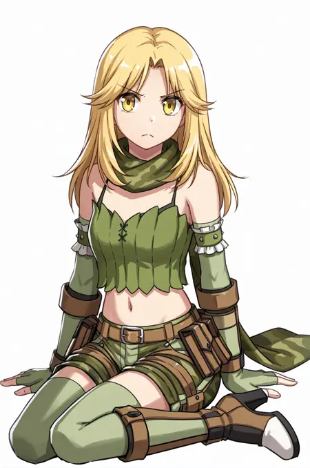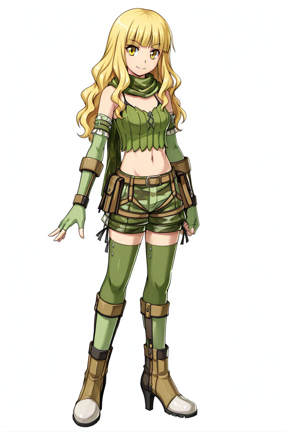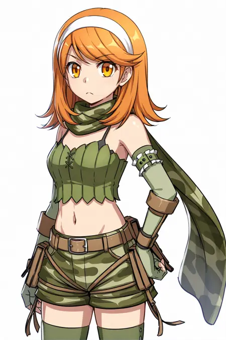 prompt: rangerRO, navel, elbow fingerless gloves, midriff, camouflage scarf, camouflage shorts, crop top, pouch, green camisole, green armlet, frown, thighhighs, high heel boots