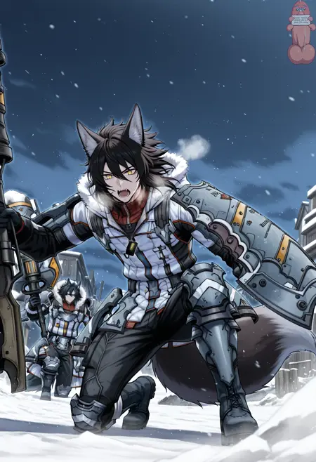 federation_winter_uniform, Scout_winter_uniform, 장갑, 부츠, 무릎 패드, 군복, 소총 들기, 소총, 갑옷, 개 목표, 흰 코트, 털 장식,