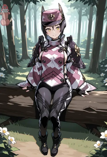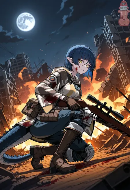 kai_summer_outfit, 손가락 없는 장갑, 부츠, 군복, federation_summer_uniform, 폰초, 저격 소총, 저격 소총 들기, 카이 모자, 카모플라주, 검은 신발, 조이는 바지,