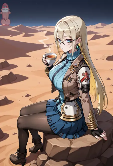federation_summer_uniform, 군복, summer_Riley_Miller_uniform, 파란 치마, 검은 팬티스타킹, 리브된 스웨터, 갈색 재킷, 열린 재킷, 손가락 없는 장갑, 하이힐 부츠,