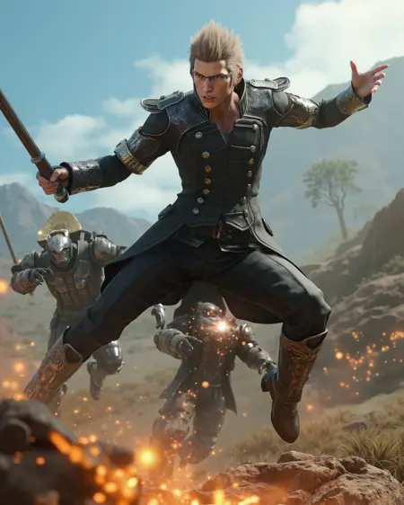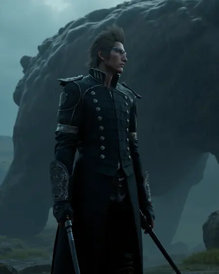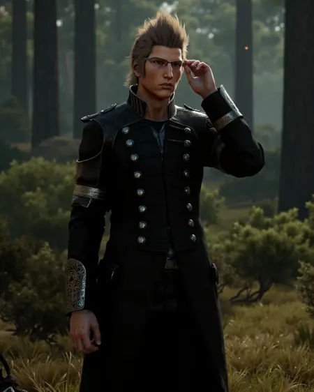 For his Kingsglaive outfit: black, detailed military-style uniform with silver accents and a high collar, along with black leather gloves, black leather pants, and knee high black boots with metal accents