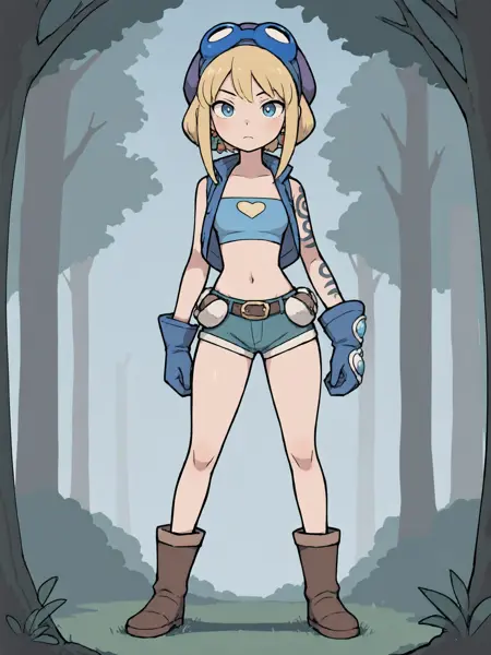 Outfit Tags: vest, tube top, shorts, belt, gloves, googles on head, jewelry, boots,