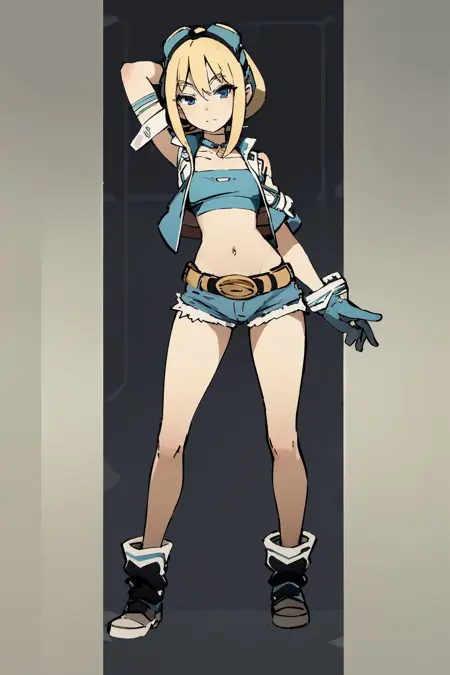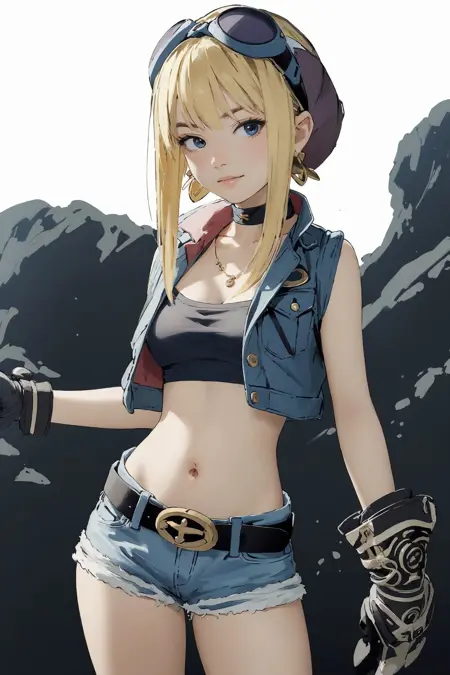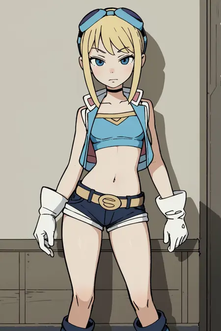 衣装タグ:ベスト、チューブトップ、ショートパンツ、ベルト、手袋、頭にゴーグル、ジュエリー、ブーツ、