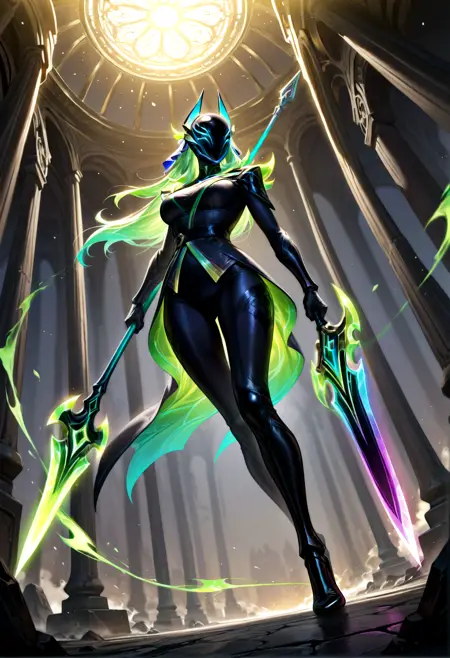 英雄联盟中以紫色发光能量和太空纹理紧身衣为主要风格的天界风格。