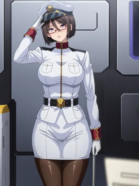 海軍制服、白い制服、茶色のパンツホース、黒いベルト、白い手袋、ピークキャップ、鉛筆スカート、白いスカート、アンクルブーツ、靴ひも式ブーツ