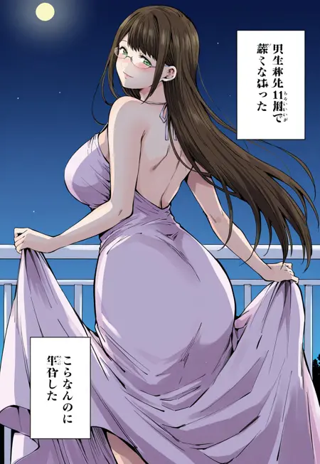 yuzuki hanyu, long brown hair, straight bangs, glasses, green eyes, large breasts, wide hips, mature woman, manga, world's end harem