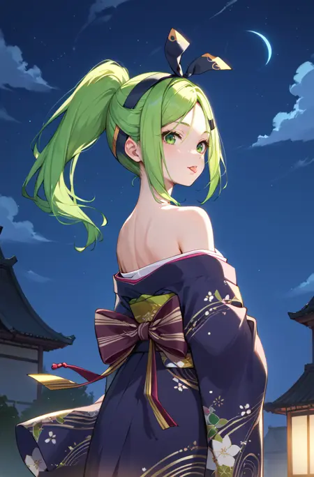 kiryutouko, long hair, green hair, parted bangs, hairband, hairclip, ponytail, green eyes