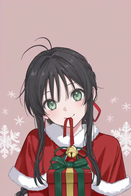 yagamitoa, long hair, black hair, braid, antenna hair, sidelocks, green eyes, hair ribbon